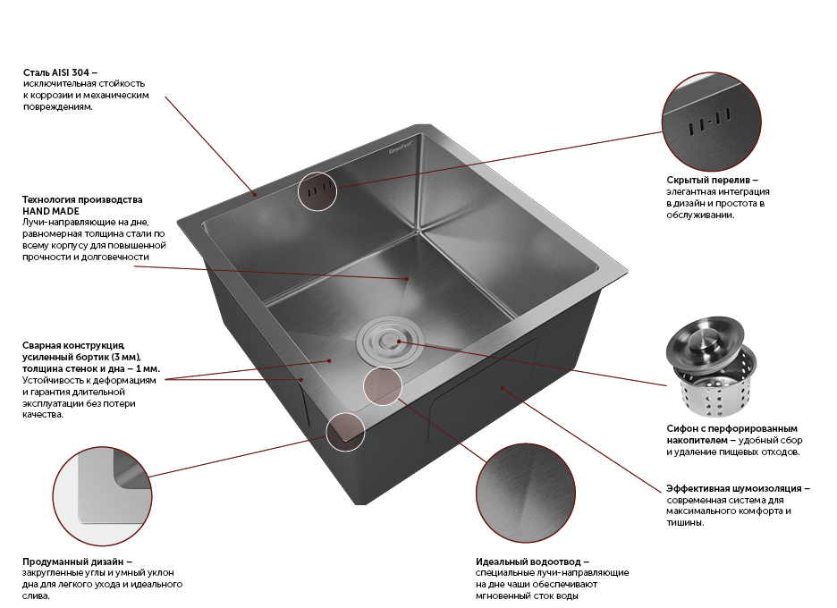✔ Отсутствие шума - за счет толщины металла, специального шумоподавляющего покрытия и полимерных накладок с обратной стороны мойки.